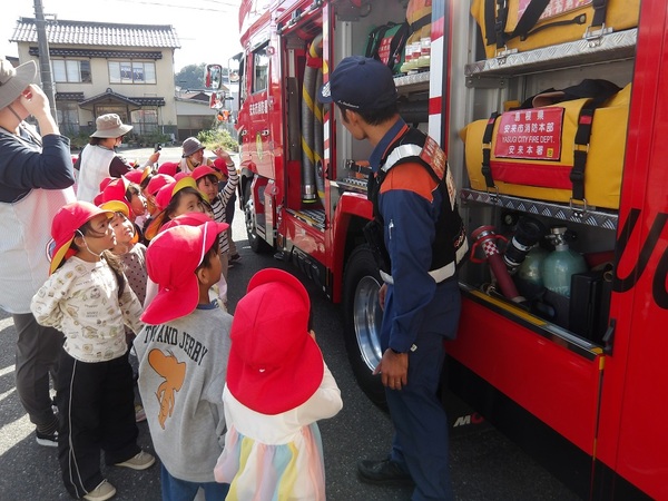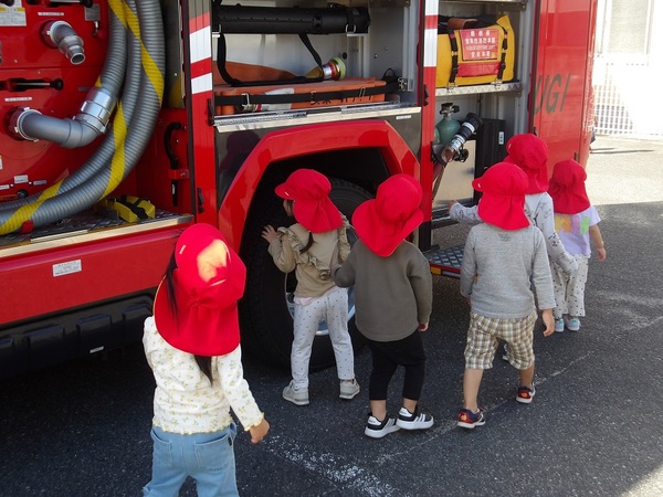 そのあとで、今回は消防車で来てくださったので、クラスごとで見に行きました。