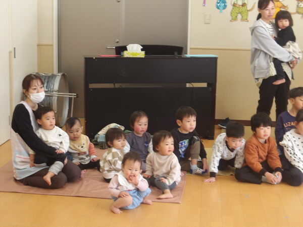 10月の誕生会1 10月の誕生会をしました。そら組さん2名、つき組さん3名、にじ組さん3名、ほし組さん1名の13名で、1Fと2Fで分かれて行いました。こちらは、そら組さんとつき組さん、お母さんからカードをよんでもらって嬉しそうでしたね。 2025-11-04