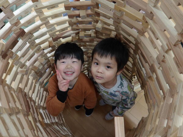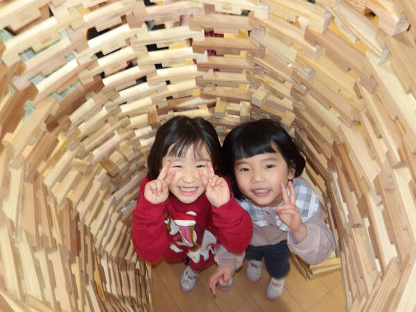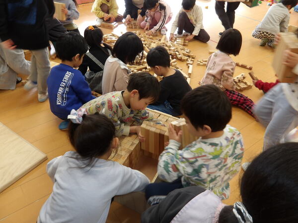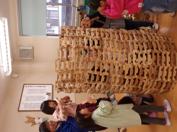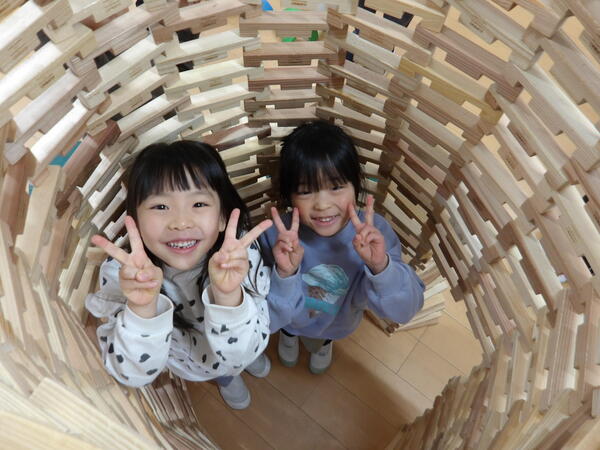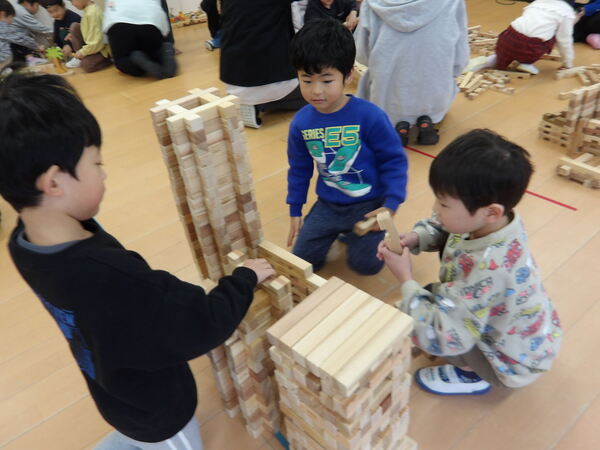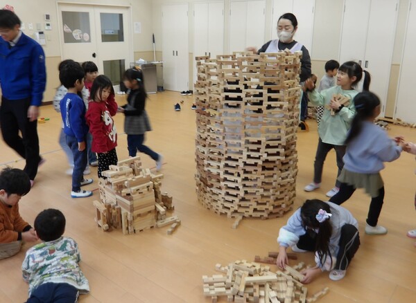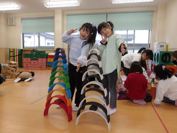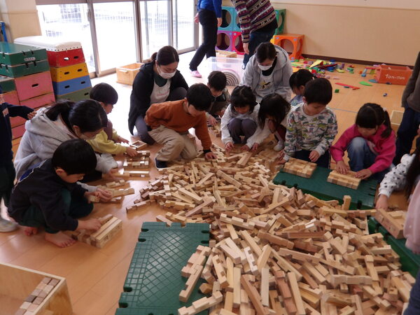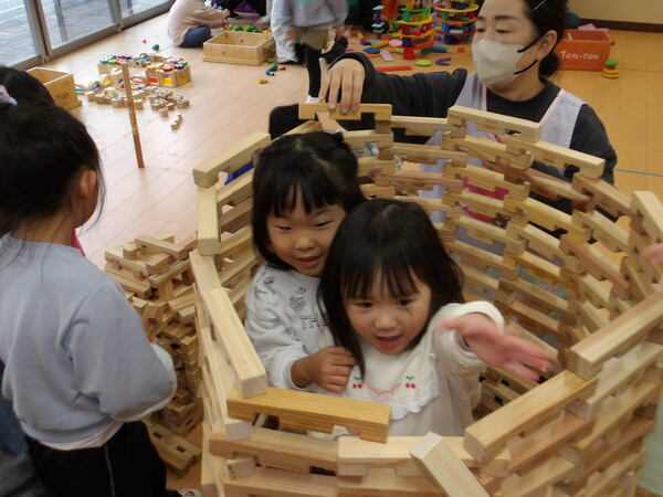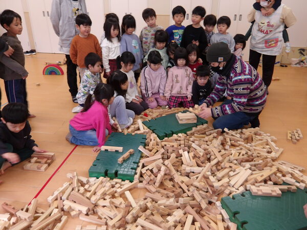 木のおもちゃで遊んだよ!(そら組)3 いっぱい遊んだ後は、木の積み木についてパズルのような片付け方を教わって、みんなで楽しく大箱に詰めていきましたよ🎵最後にみんなでTonTonさんにお礼を言ってポーズ!いっぱい遊んで満足そうな顔・顔・顔でした。 2026-01-14