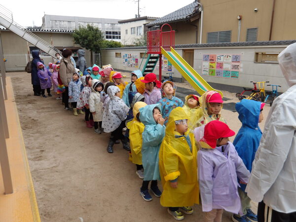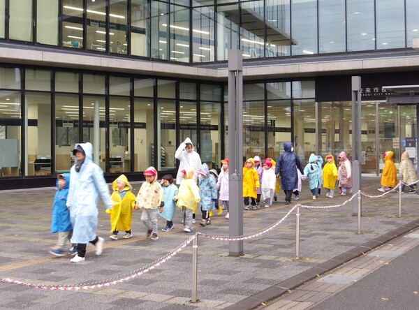 わくわく発表会リハーサルしたよ!(つき・そら組)2 近くの中央交流センターでのリハーサルには、つき組さんとそら組さんで手をつないで歩いていきました。雨模様で、カッパのご用意もありがとうございました。 2025-12-17