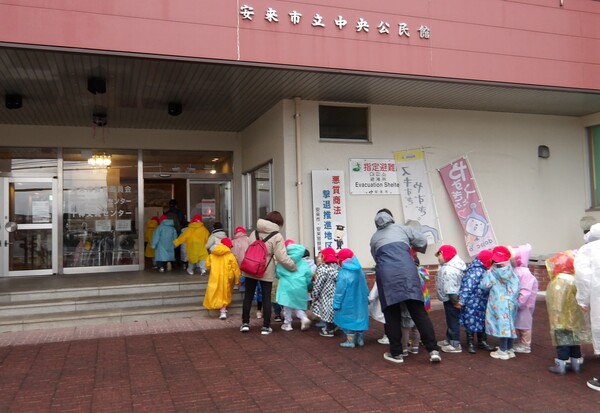 防災公園へ避難訓練をしました2 子どもたちは先生の言うことをよく聞いて上手に歩くことができましたよ。前回の反省を生かして、散歩車のほし組さんを先に公園に着いて降ろし、慣れないお散歩ロープで頑張って最後尾を歩いているにじ組さんを散歩車で迎えに行きました。協力しあい全クラスが公園に着いて、点呼の確認がとれたところで訓練を終了しました。その時点で保護者の方へお迎えをお願いする通信の訓練を行いました。 2025-11-21