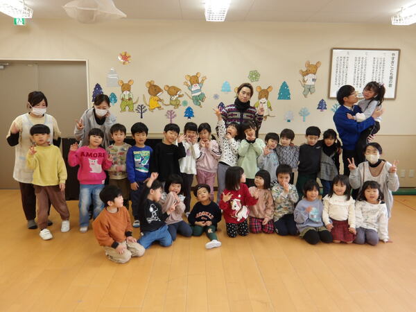 11月・12月の誕生会4 そら組のお友だちから「きみにあえたから🎵」、つき組のお友だちからは「幸せなら手をたたこう🎵」の歌のプレゼント。後半は、ほし組さんの誕生児親子も加わって、職員の出し物で切り絵と「三匹のくま」の劇を見て盛り上がりましたよ。最後に、ハッピバースデーの歌とケーキのろうそくの火を消して和やかに終わりました。 2025-12-19