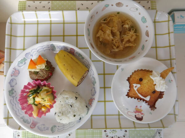 この日の給食とおやつは、給食先生からのエールで「わくわく発表会がんばれ🎵」献立でした。げきのつき組のようかい・ランチと、そら組のうらしまたろうのカメ・スコーンが出ましたよ。