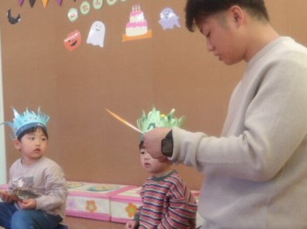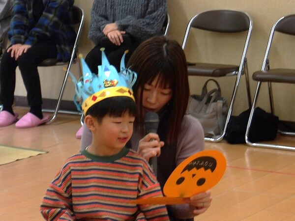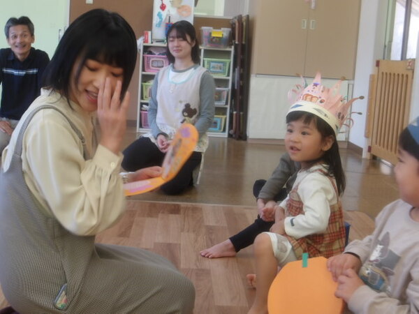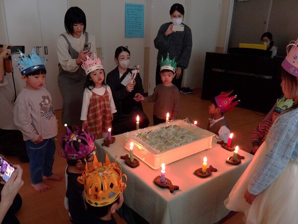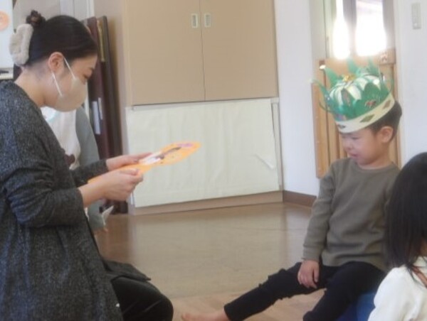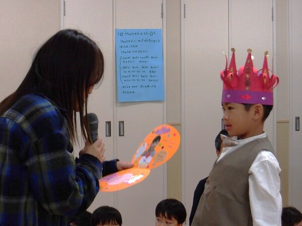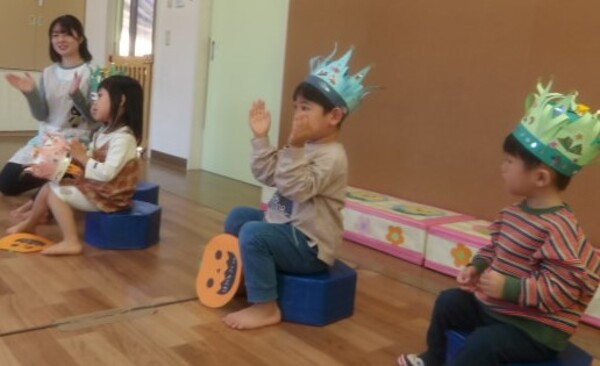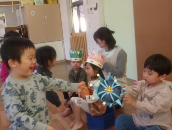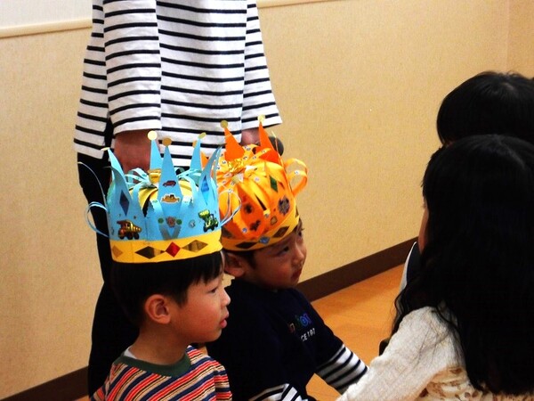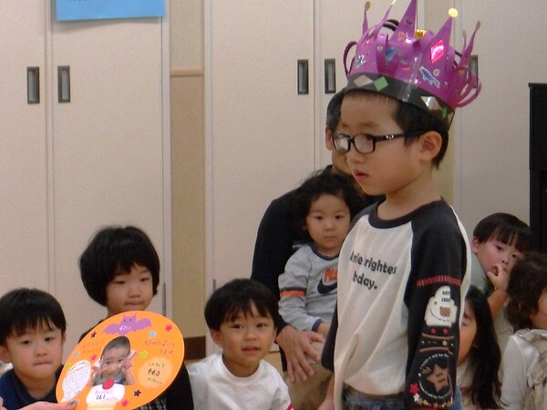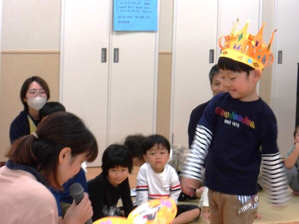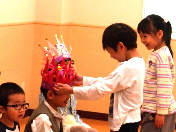 お友だちにカンムリをかぶせてもらい、みんなにお祝いしてもらえてよかったですね。