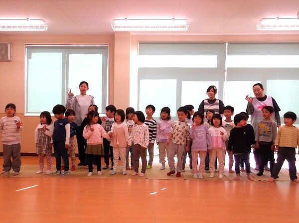 今度は遊戯室で、3〜5歳児クラスの子どもたちに演奏していただきました。