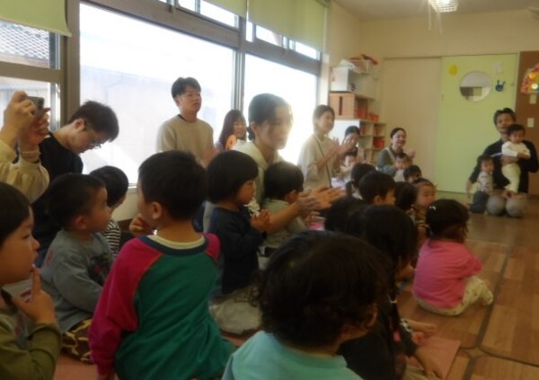 先生のげきは「ぞうの子どんちゃん」。にじ組とほし組の誕生児親子も一緒に、ろうそく消しまでみんなで楽しむことができてよかったですね。