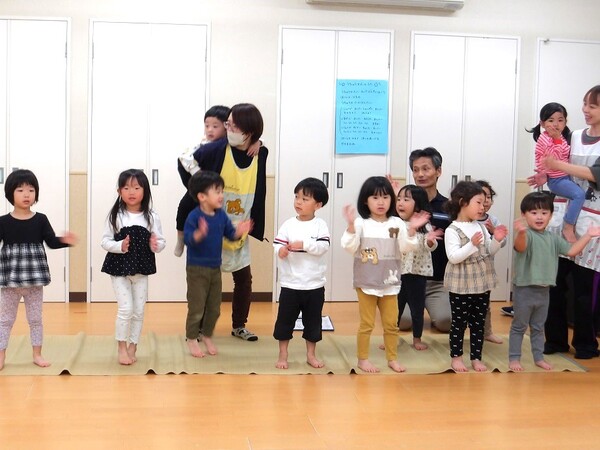 まず、0〜2歳児クラスの子どもたちの前で、お二人の先生が安来節の歌と三味線を、次はその演奏に合わせて銭太鼓も披露してくださいました。初めて聴いたであろう子どもたちでしたが、だれも静かに目を凝らして耳をすませて聴いていて、それくらい素敵な演奏でした♫